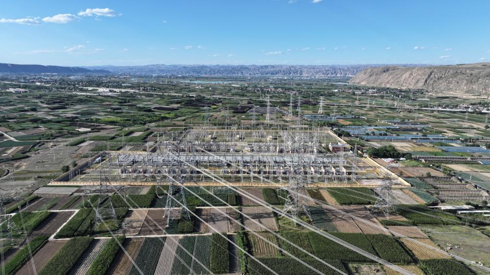 图为甘肃省兰州市榆中县境内的750千伏兰州东变电站全貌(无人机相片)。(张子墨 摄)